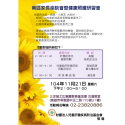 親愛的南區小太陽們您好: 期待已久的健康照護說明會來嚕~11月我們與您相約在高雄 我們邀請專業講師來幫家長們上課,請家長趕快撥電話報名喔!! 活動日期:104年11月21日 星期六...南區家長座談會暨健康照護研習會 -